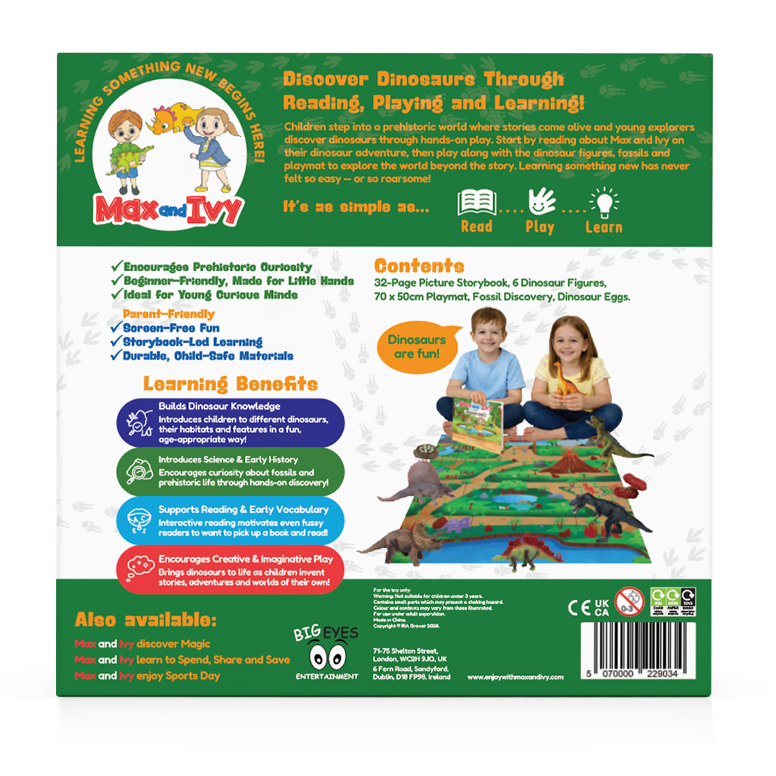 Max and Ivy explore Dinosaurs is a beginner set for children aged 3–7, based on the Read, Play, Learn concept. The beautifully illustrated storybook follows Max and Ivy as they learn about dinosaurs, while the accompanying dinosaur figures and fossils bring the story to life through hands-on play.